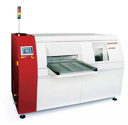 The ASSCON VP800 system has been developed especially for serial production and prototyping. Thanks to its multi-chamber design, the system can also be used for implementing close-to-production process qualifications. As the processing zone, it is possible to apply the soldering process in the VP800 system to the standard achieved by current production lines in a compact environment. Here the system especially stands out of its simple handling, enabling each user to solder high-quality modules fault-free.